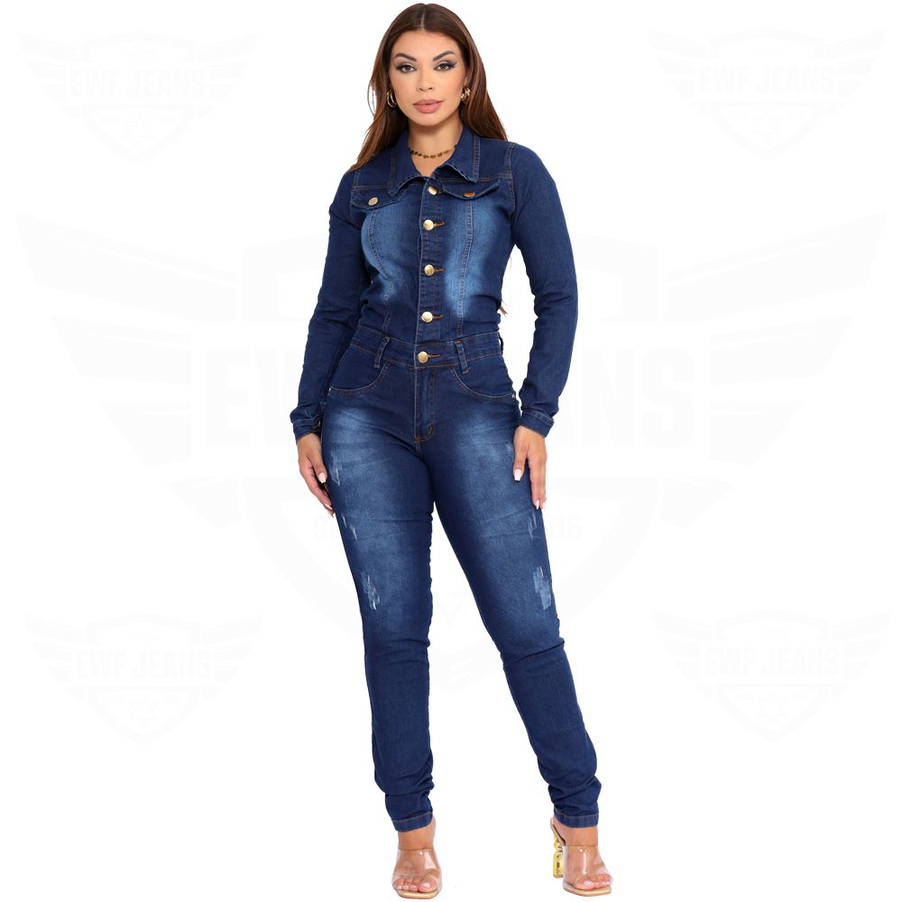 Macacão Jeans Feminino Manga Longa - EWF Jeans - Azul Escuro