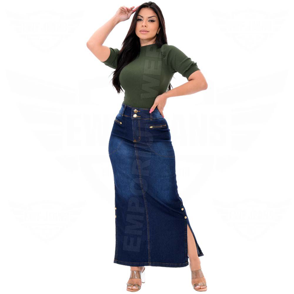 Saia Longa Jeans com Elastano e Abertura Lateral - EWF Jeans - Azul Escuro