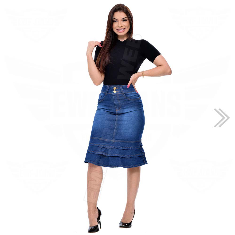 Saia Midi Jeans com 3 Babados - EWF Jeans - Azul Escuro