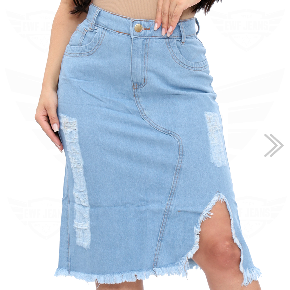 Saia Midi Jeans Destroyed Rasgo Frontal - EWF Jeans - Azul Claro