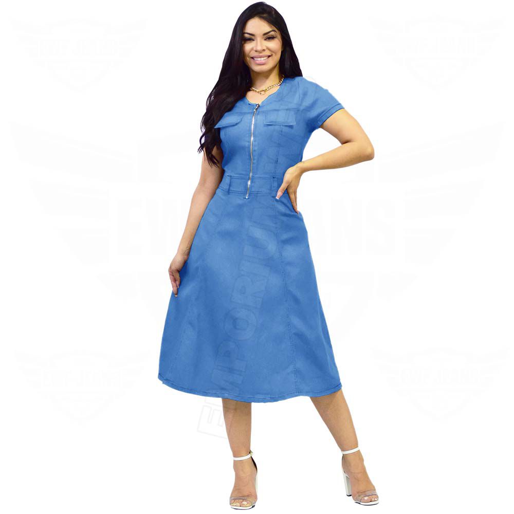 Vestido Midi Evasê Jeans Manga Curta Estilo Princesa - EWF Jeans Azul Claro